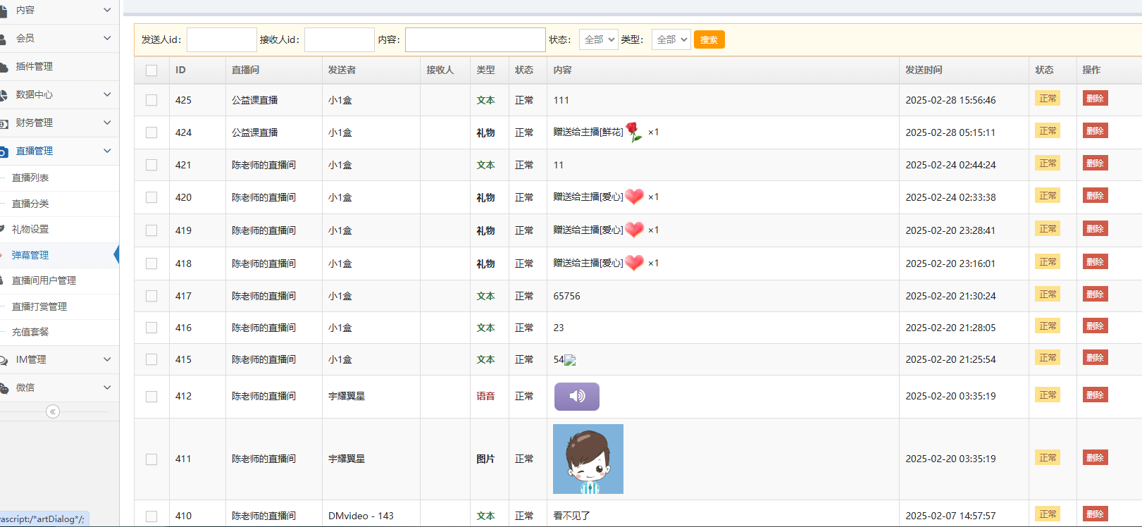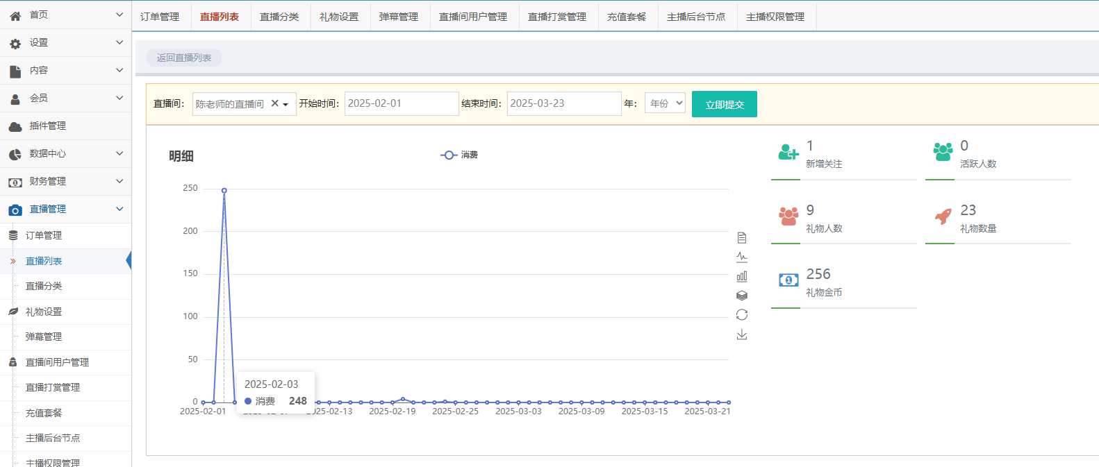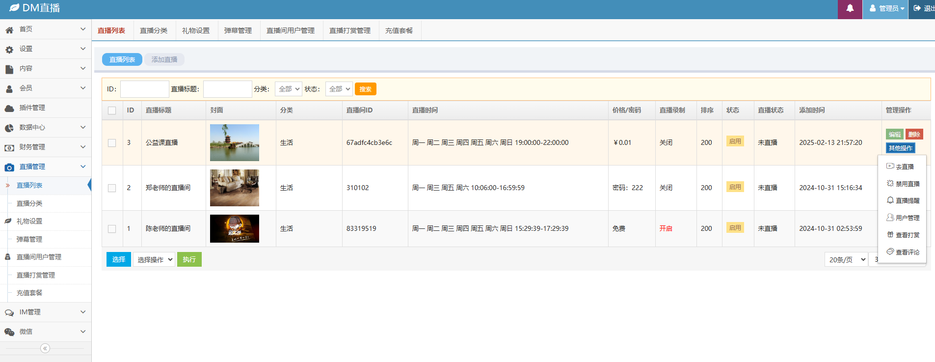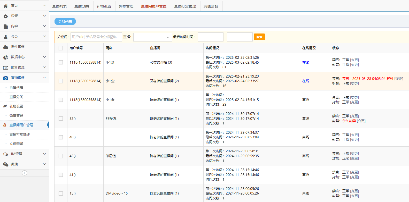 - 直播管理:直播分类、直播管理、弹幕管理、直播间用户管理。