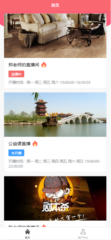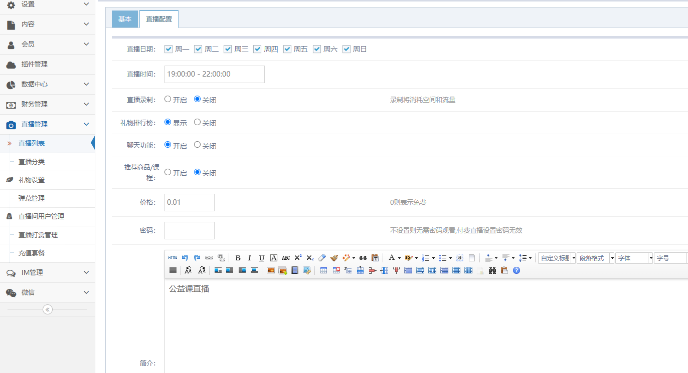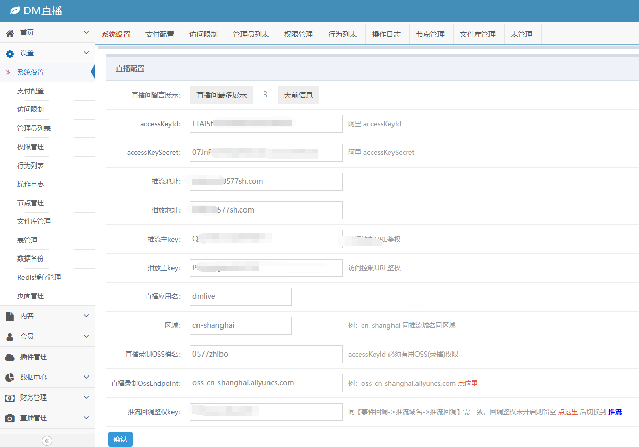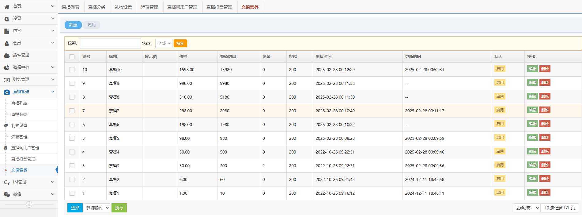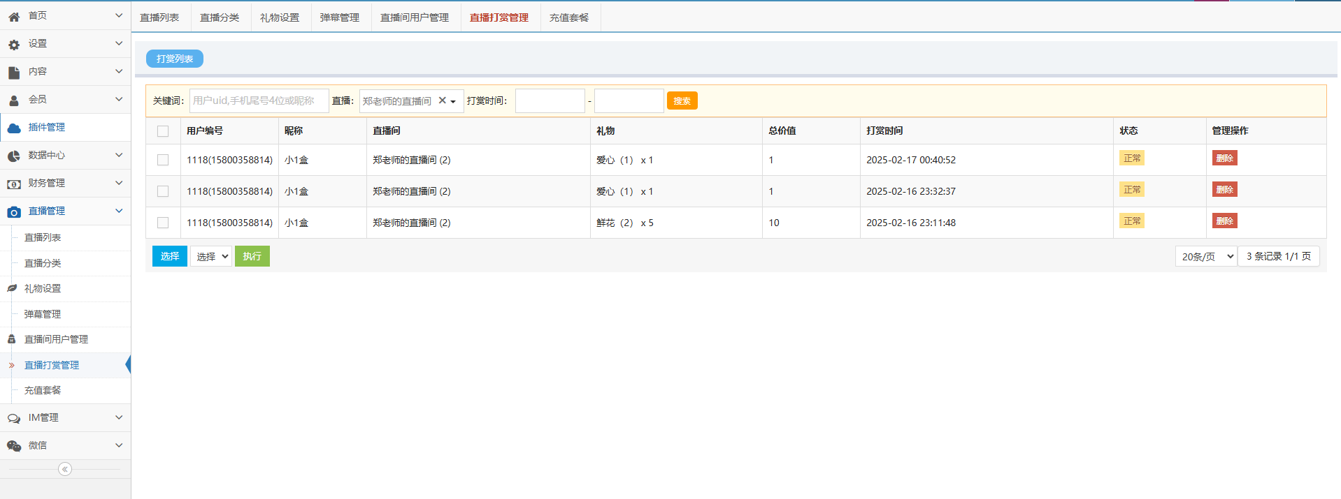 - 直播管理:直播分类、直播管理、弹幕管理、直播间用户管理。