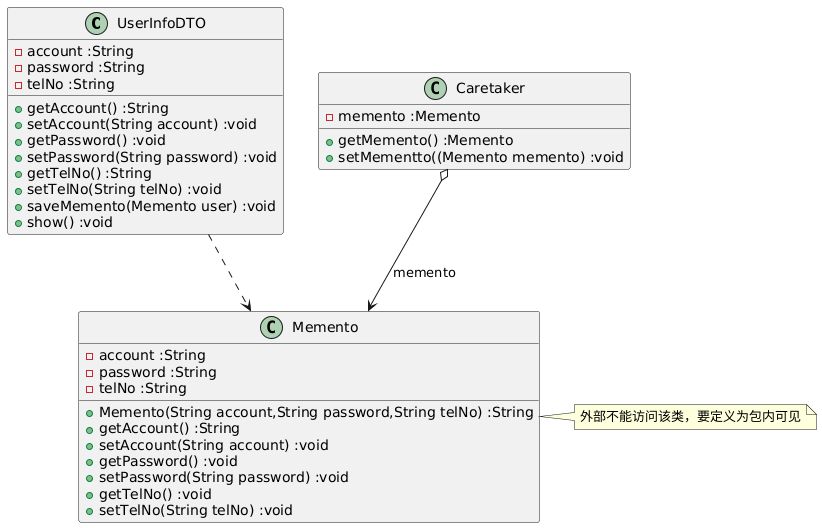 * 在不破会封装的前提下,捕获一个对象的内部状态,并在该对象之外保存这个状态,这样可以在以后将对象恢复到原先保存状态。并且这个这个状态不能被这个对象和负责人以外的对象访问。