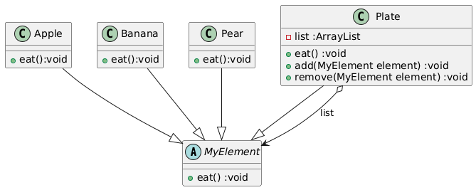 * 如在水果盘(Plate)中有一些水果,如苹果(Apple)、香蕉(Banana)、梨子(Pear),当然大水果盘中还可以有小水果盘。现需要对盘中遍历吃,当然如果对一个水果盘执行吃的方法,实际上就是吃其中的水果。