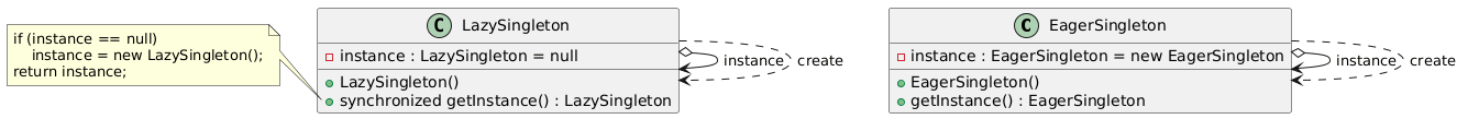 * 懒汉式:构造函数也私有化,但是在第一次引用时将自己实例化。饿汉式在资源利用效率上不如懒汉式,单懒汉式在初始化实例时有可能耗费大量时间,意味着可能多个线程在此期间引用,需要做好同步化机制进行控制。