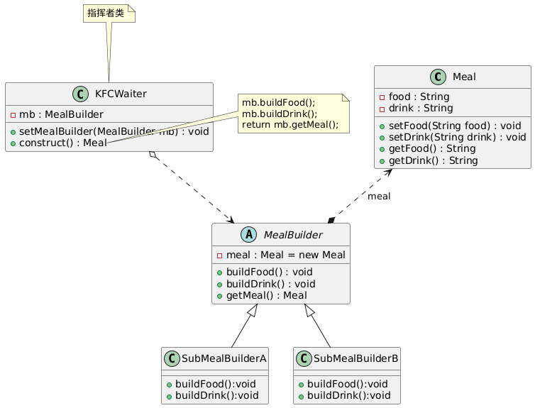 * 如KFC创建套餐:套餐是一个复杂对象,它一般包含主食(如汉堡、鸡肉卷)和(饮料、可乐)等组成部分,不同的套餐有不同的组成部分,而KFC的服务员可以根据顾客的要求,一步一步装配这些组成部分,构造一份完整的套餐,然后返回给顾客。