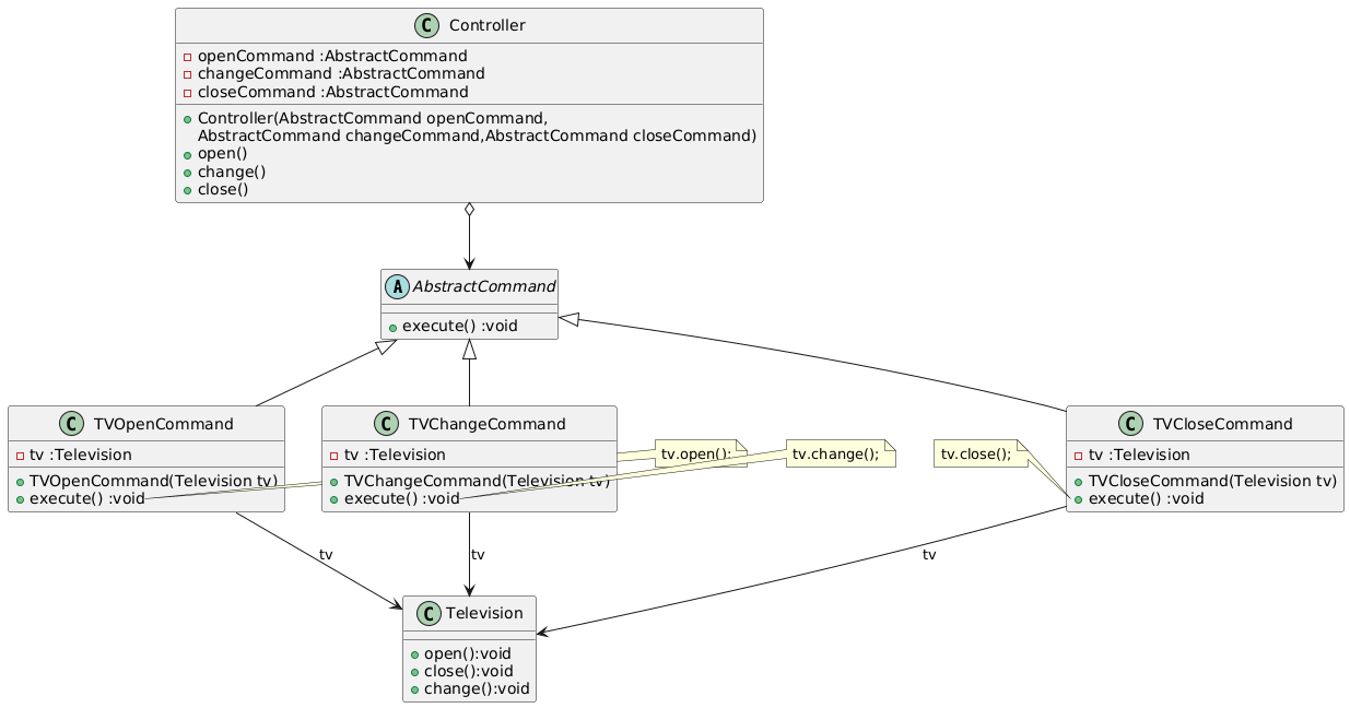* 如电视机是请求的接收者,遥控器是请求的发起者,遥控器上有一些按钮,不同的按钮对应电视机不同的操作。抽象命令角色由一个命令接口来扮演,有三个具体的命令类实现了抽象的命令接口,这个具体命令类分别表示三种操作:打开电视机,关闭电视机和切换频道。