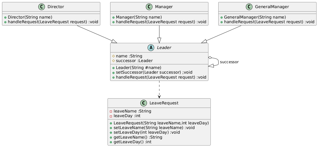 * 如某OA系统需要提供一个假条审批模块,如果员工请假天数小于3天,主任可以审批请假条;若天数大于三天小于10天,经理可以审批;如果员工请假天数大于10天小于30天,总经理可以审批;如果超过30天,总经理也不能审批,提示拒绝相关信息。