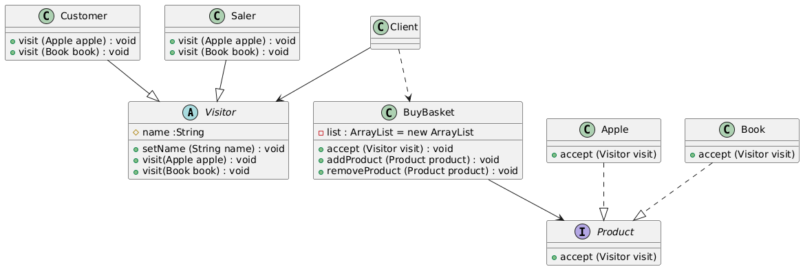 * 如顾客在超市中将选择的商品,如苹果、图书等放在购物车中,然后到收银员处付款。在购物过程中,顾客需要对这些商品进行访问,以便确认这些商品的质量,之后收银员计算价格时也需要访问购物车内顾客所选择的商品。此时,购物车作为一个ObjectStructure(对象结构)用于存储各种类型的商品,而顾客和收银员作为访问这些商品的访问者,他们需要对商品进行检查和计价。不同类型的商品其访问形式也可能不同,如苹果需要过秤之后再计价,而图书不需要。