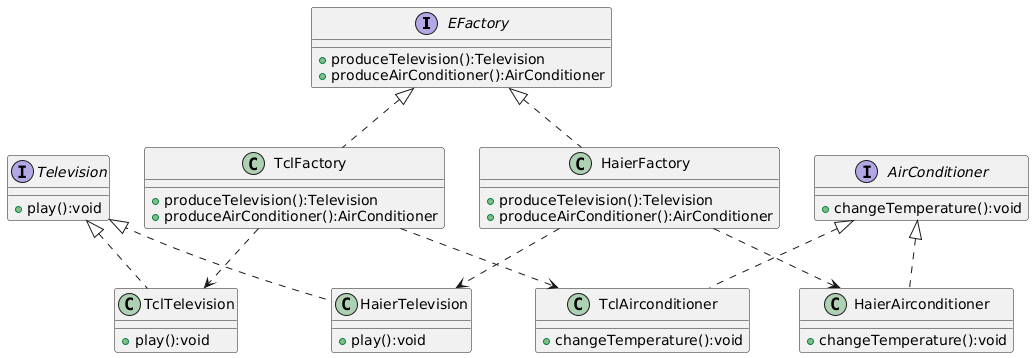 * 如一个电器工厂可以产生多种类型的电器,如海尔工厂可以生产海尔电视机、海尔空调等,Tcl工厂可以生产TCL电视机,TCL空调等,相同品牌的电器构成一个产品族,而相同类型的电器构成一个产品等级结构。