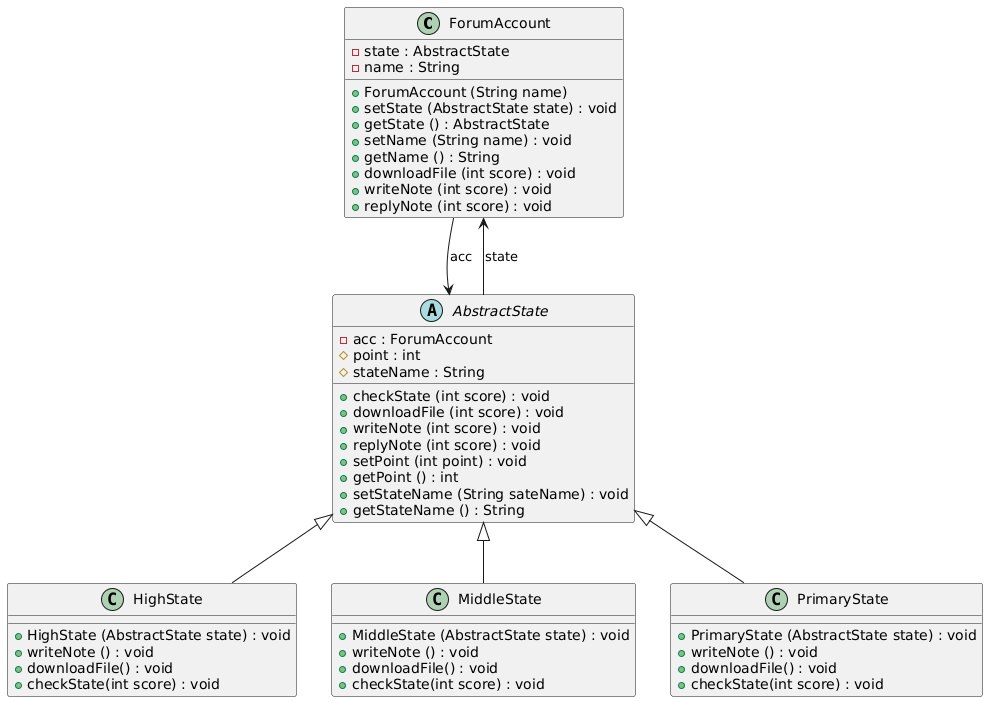 * 如某论坛系统中,用户可以发表留言,发表留言将增加积分;用户也可以回复留言,回复留言也将增加积分;用户还可以下载文件,下载文件将扣除积分。该系统用户可以分为三个等级,分别是新手、高手和专家,这三个等级对应三种不同的状态。